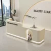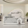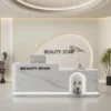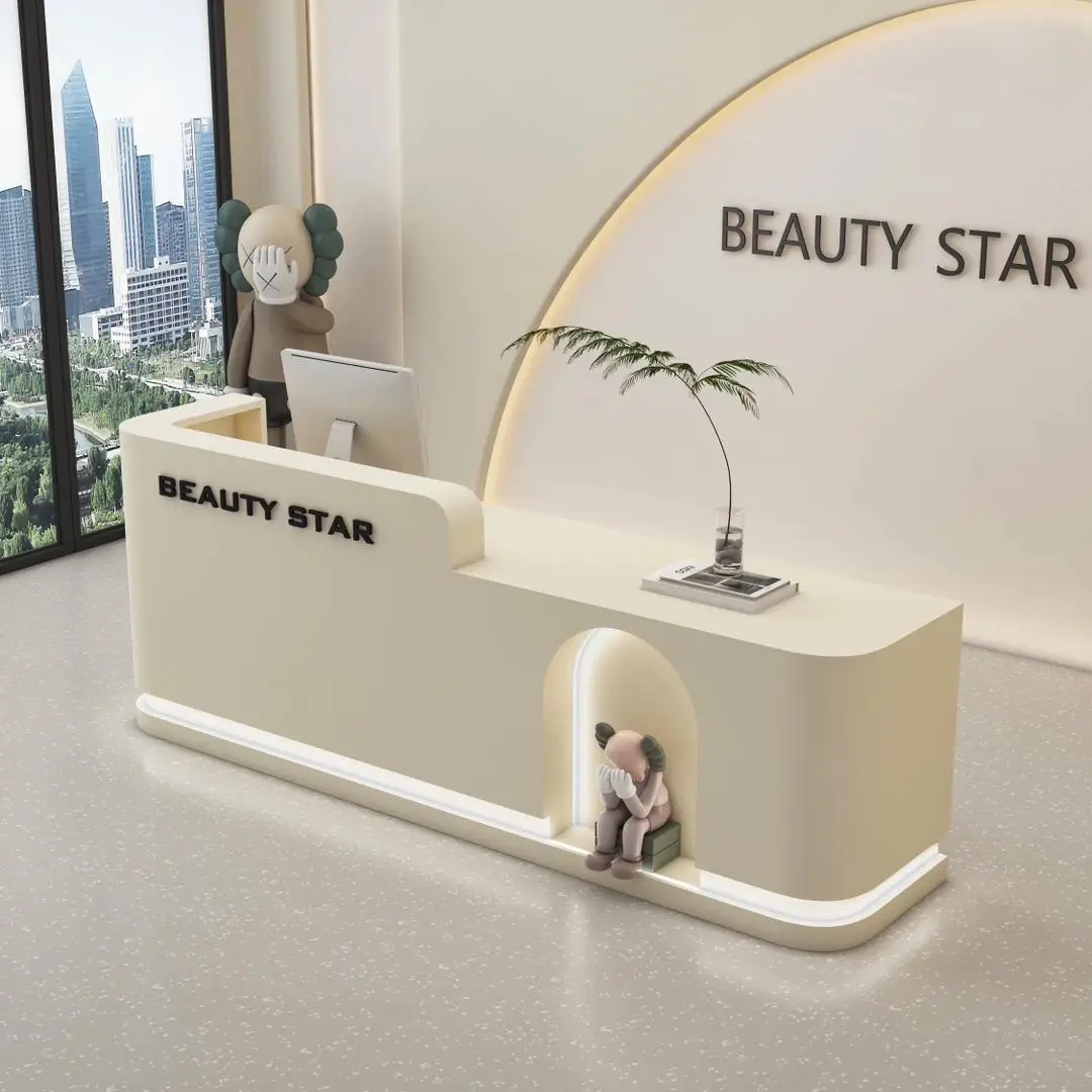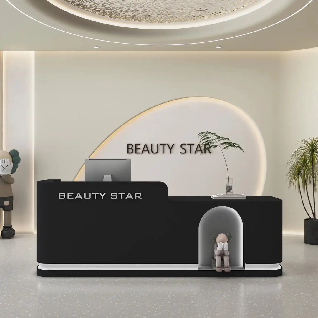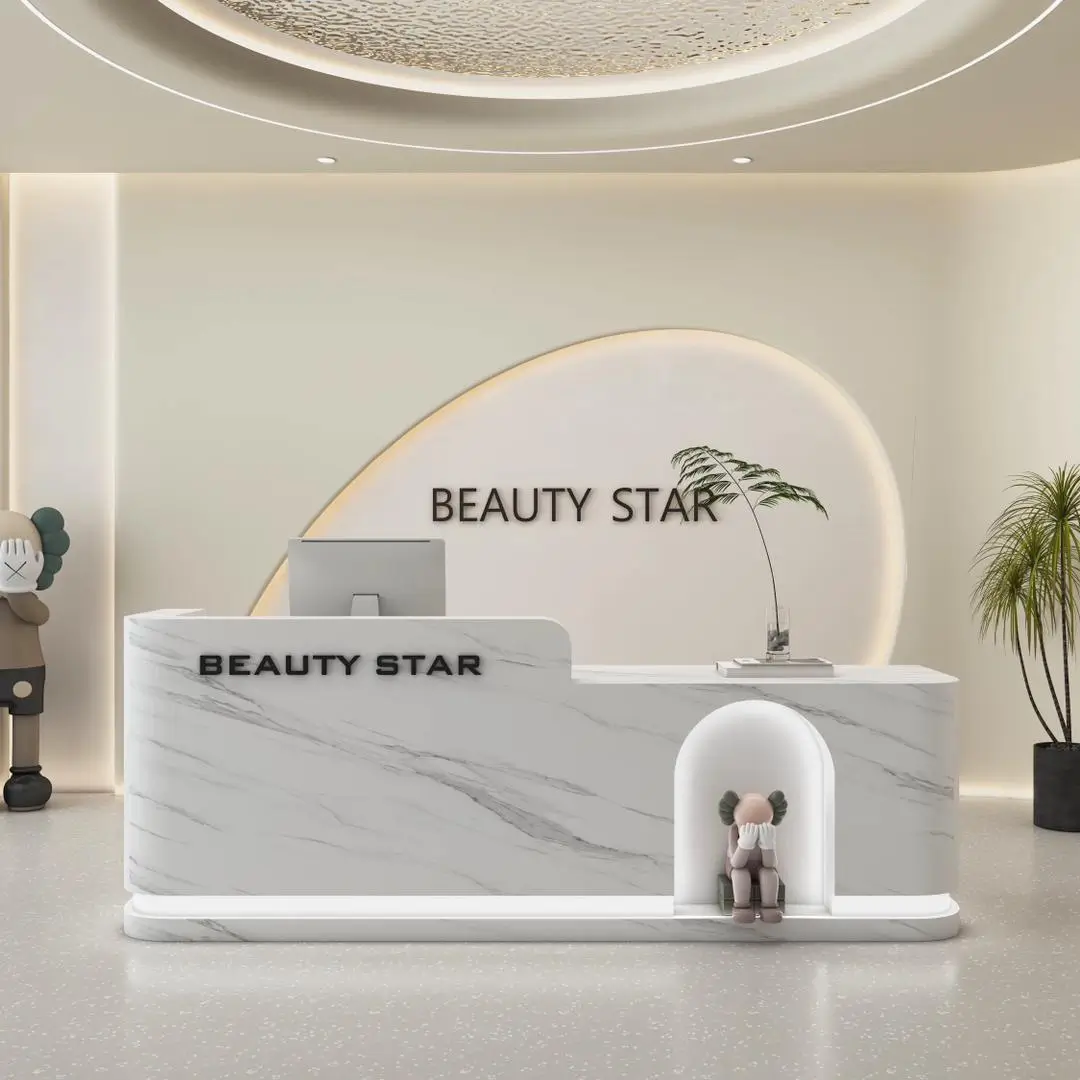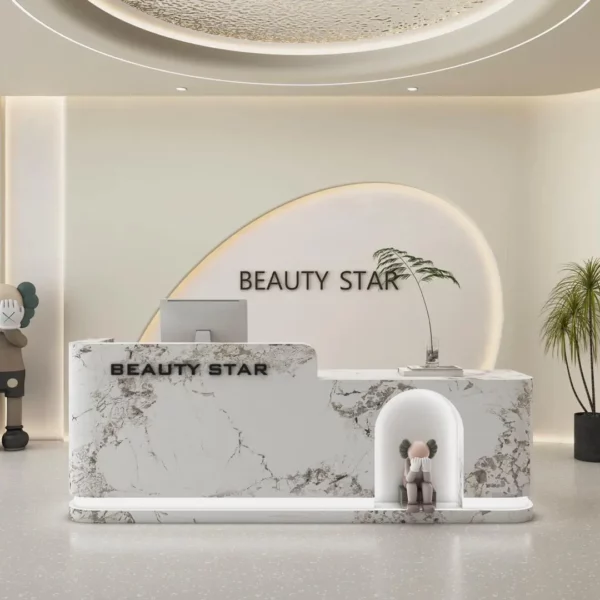 This reception desk oozes soft luxury—perfect for beauty salons or boutique studios. Its curved, matte-white surface feels velvety-smooth, while the integrated LED strip casts a warm, glowing halo that instantly calms guests. Users love the cute niche (ideal for small decor) that adds a playful, personalized touch, and the double-branding design reinforces your venue’s identity seamlessly. The spacious countertop fits a monitor + small items, and the seamless curves make the space feel open, not cluttered. It’s not just a desk; it’s a welcoming first impression that matches the cozy, premium vibe of your beauty/retail space.