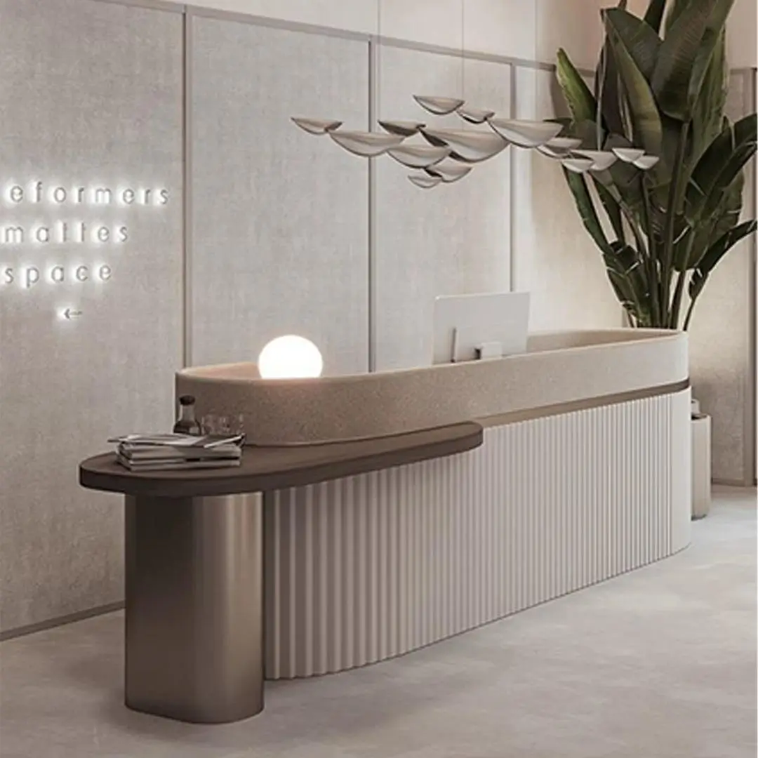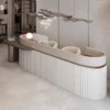 This avant-garde reception desk is a masterclass in minimalist luxury, designed to make a lasting first impression in corporate lobbies or creative studios. The curved silhouette, textured stone top, and ribbed paneling blend modern architecture with warm, inviting details. Paired with the sculptural pendant light and lush greenery, it transforms any entryway into a sophisticated welcome space.
