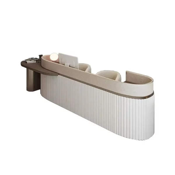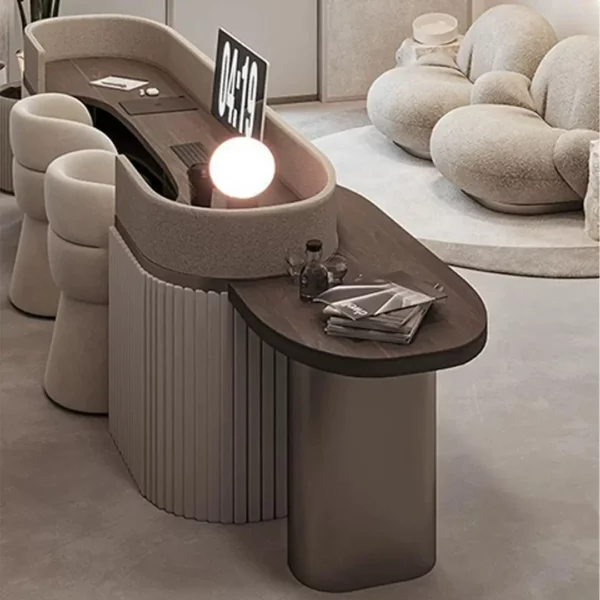 Crafted with premium stone, metal, and wood, the desk offers durability and a refined aesthetic. The integrated surface provides ample workspace, while the organic shapes create a calming, professional atmosphere. “Clients always comment on how our reception area feels both sleek and welcoming—this desk sets the tone for our brand,” notes a design studio manager.