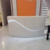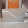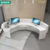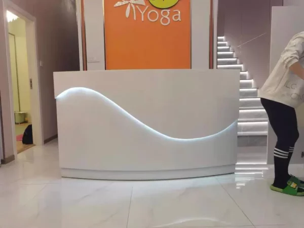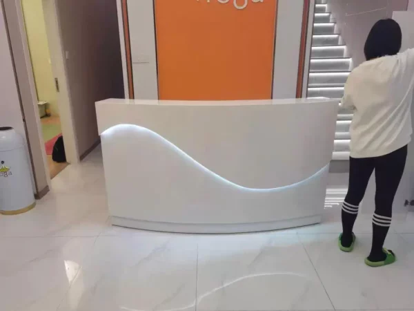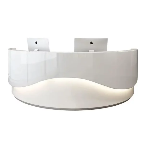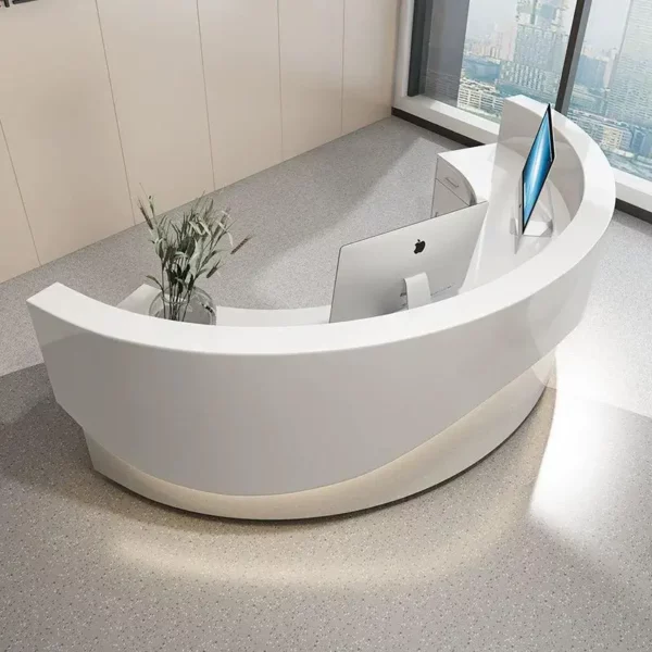 This sleek reception desk is a epitome of modern minimalism, crafted to elevate the entrance of tech firms, clinics, or boutique businesses. Its glossy white curved design with integrated LED lighting exudes a sense of innovation and professionalism. The seamless surface and ample workspace make it both a functional hub and a visual highlight, leaving visitors with an impression of sleek efficiency.