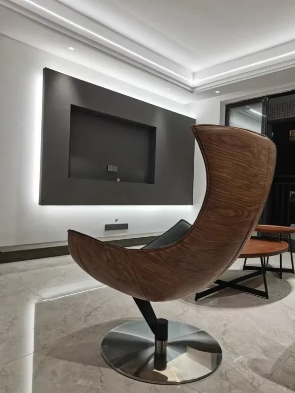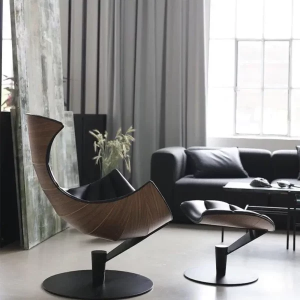 This retro-modern lounge chair is a seamless blend of timeless design and contemporary comfort, ideal for loft spaces, design studios, or upscale home offices. The black leather upholstery, paired with a curved wood frame and swivel metal base, exudes mid-century elegance with a modern twist. Its sculptural form not only serves as a visual centerpiece but also cradles the body in ergonomic comfort, making it perfect for both relaxation and focused work.