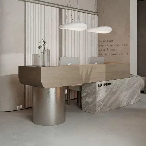 This reception desk embodies serene modern elegance—ideal for beauty salons, boutique clinics, or minimalist commercial lobbies. Its light wood-grain top feels warm and inviting, paired with a textured metal column base (sturdy yet sleek) and a marble-patterned side panel (adds subtle luxury). Users (venue owners) love the dual-monitor setup that handles busy check-ins smoothly, and the curved edge that softens guest interactions. The “RECEPTION” lettering reinforces brand clarity, while the neutral palette blends with calm, aesthetic-focused spaces. It’s not just a desk; it’s a welcoming first impression that matches your venue’s refined vibe.