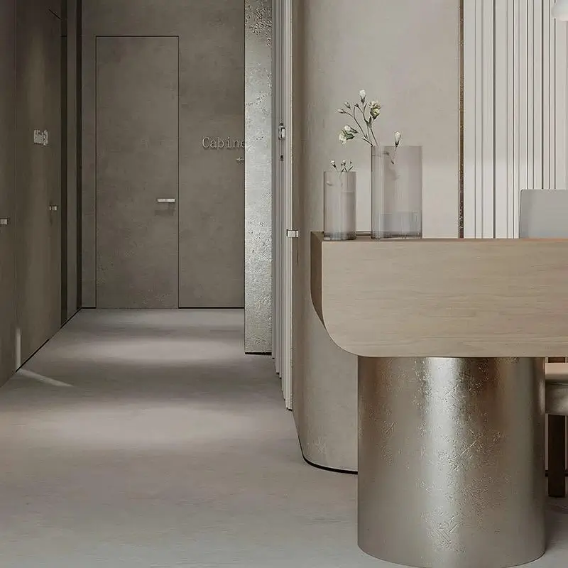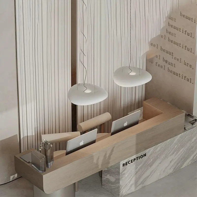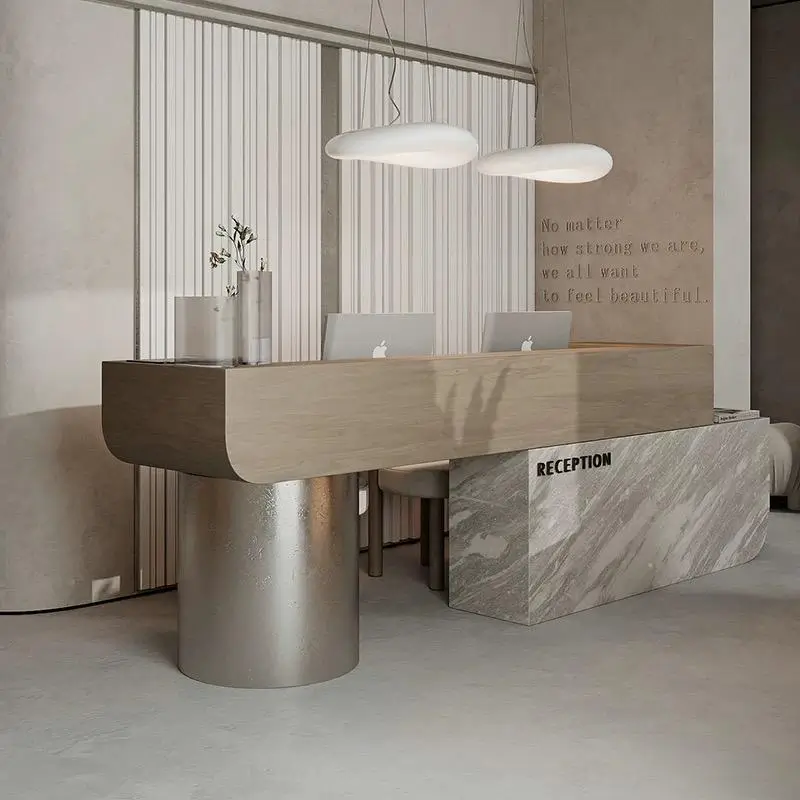 This reception desk embodies serene modern elegance—ideal for beauty salons, boutique clinics, or minimalist commercial lobbies. Its light wood-grain top feels warm and inviting, paired with a textured metal column base (sturdy yet sleek) and a marble-patterned side panel (adds subtle luxury). Users (venue owners) love the dual-monitor setup that handles busy check-ins smoothly, and the curved edge that softens guest interactions. The “RECEPTION” lettering reinforces brand clarity, while the neutral palette blends with calm, aesthetic-focused spaces. It’s not just a desk; it’s a welcoming first impression that matches your venue’s refined vibe.