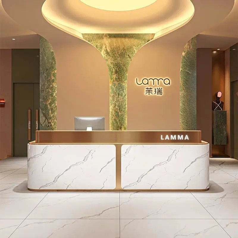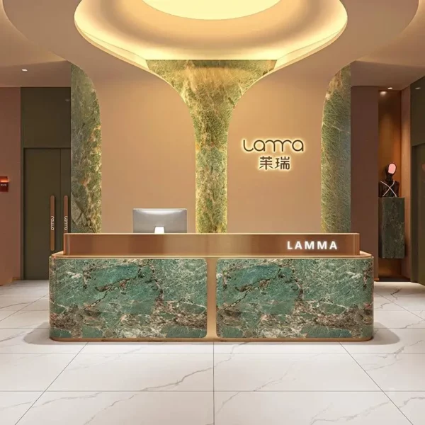 This reception desk exudes opulent elegance—ideal for luxury spas, high-end clubs, or premium boutiques. Its emerald marble-patterned surface boasts a glossy, rich texture that catches light beautifully, while the rose gold metal trim adds a lavish, refined edge. Users love how the dual-branding (backlit logo + countertop lettering) instantly elevates the venue’s premium vibe, and the spacious countertop fits a monitor + essentials without cluttering the sleek design. The smooth, rounded edges feel polished to the touch, making every guest interaction feel sophisticated. It’s not just a desk; it’s a statement piece that tells your brand’s luxury story the moment guests walk in.