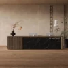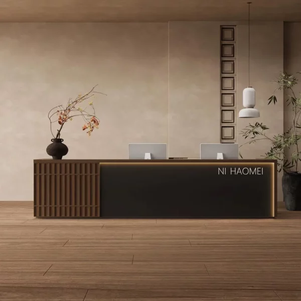 This reception desk weaves Oriental elegance with modern functionality, making it a standout for serene, upscale spaces. The vertical slatted wood panel adds a warm, textured charm that softens the venue’s vibe, while the speckled stone-like countertop feels smooth and premium to the touch. Users love how its integrated LED lighting casts a gentle glow—perfect for creating a welcoming ambiance for guests. Hidden cable management keeps the workspace neat, and the dual-monitor setup fits busy reception needs seamlessly. It’s not just a desk; it’s a quiet statement of taste that makes every visitor feel relaxed and impressed.