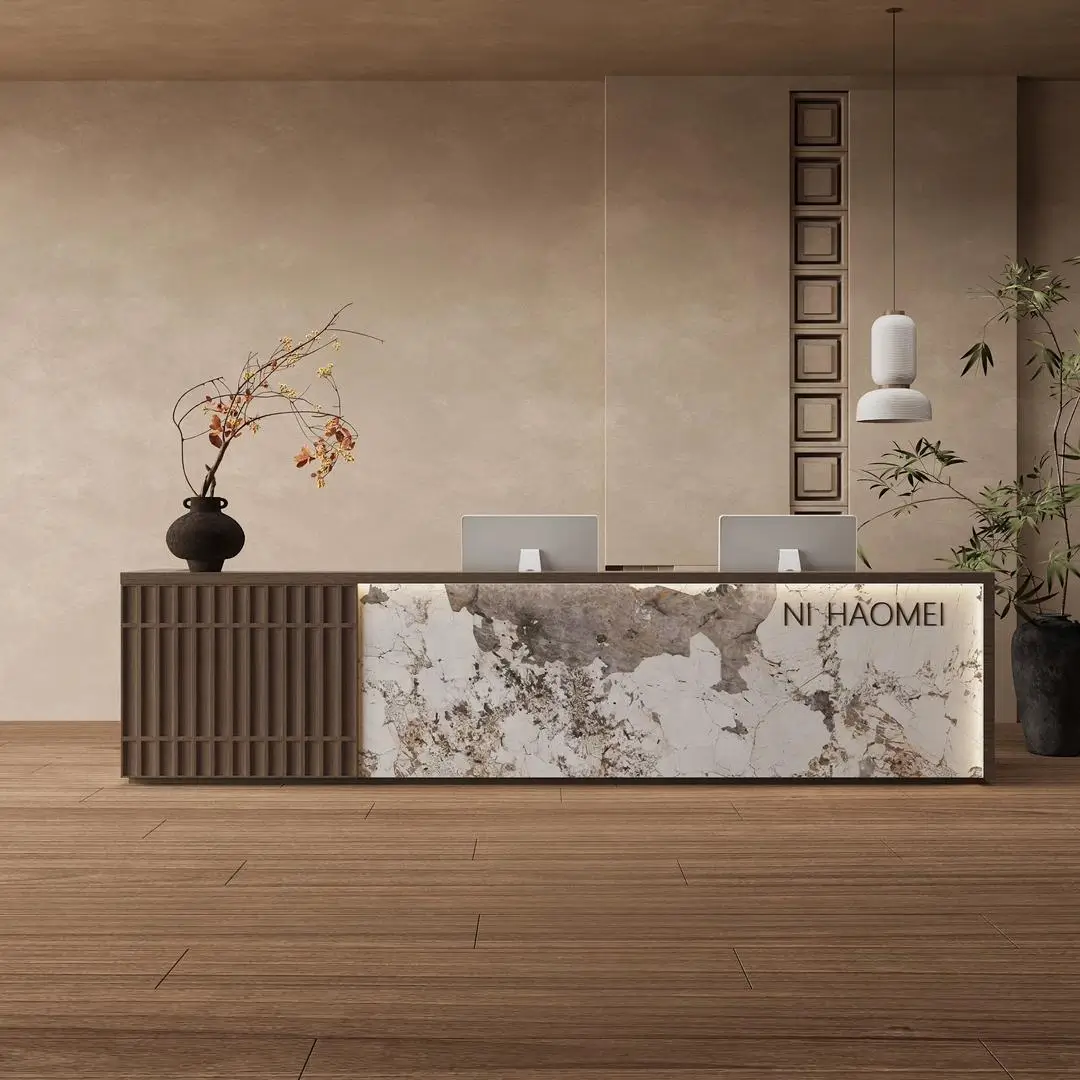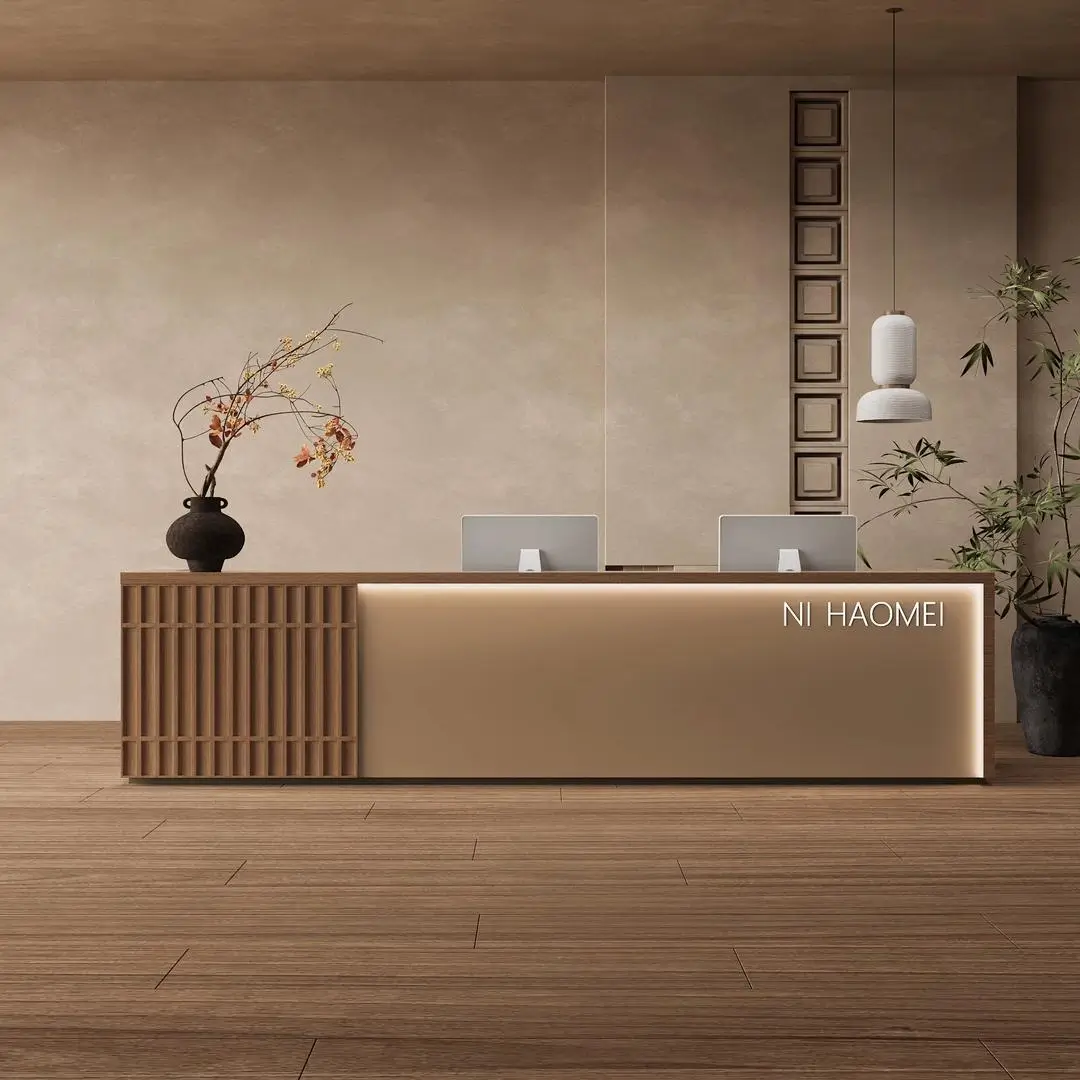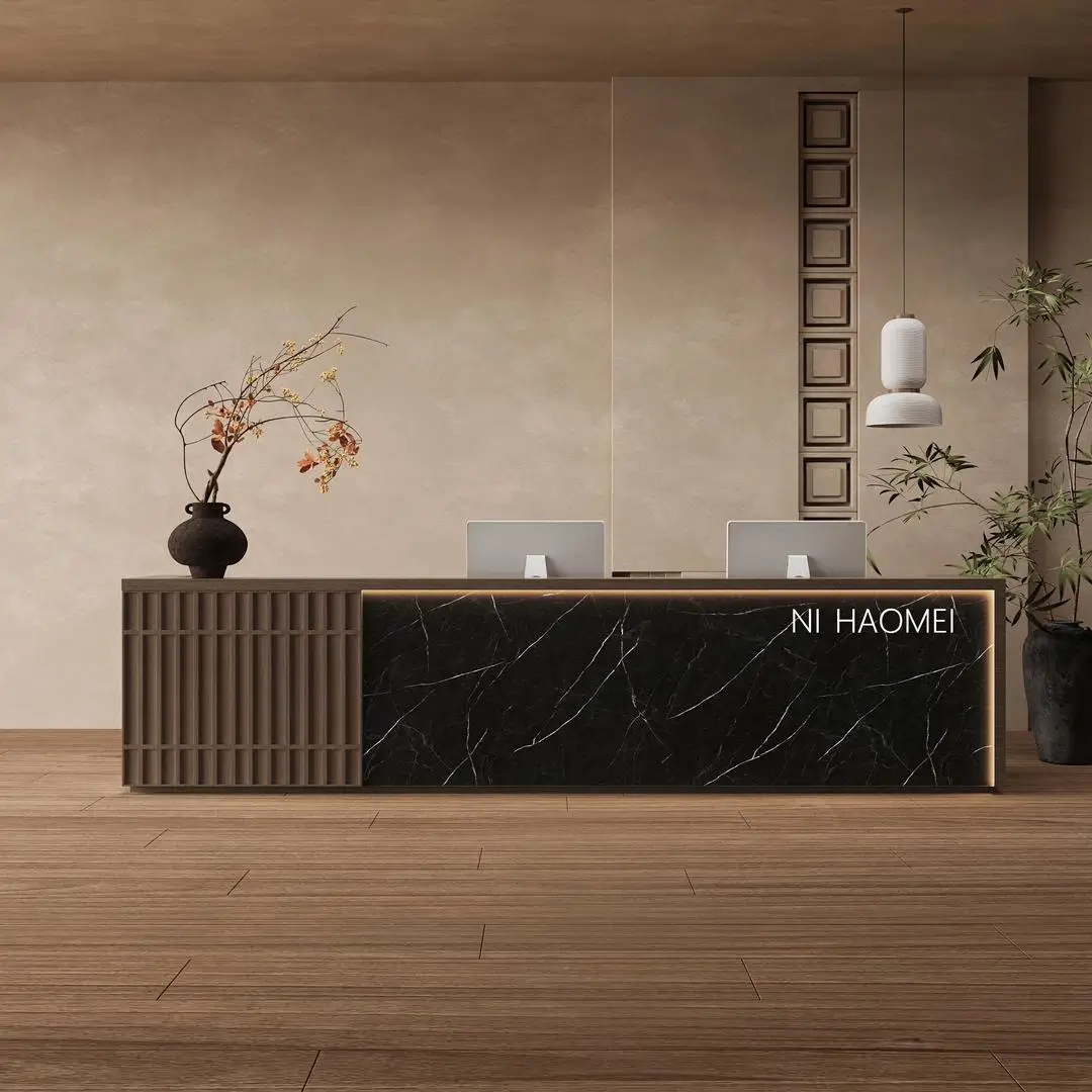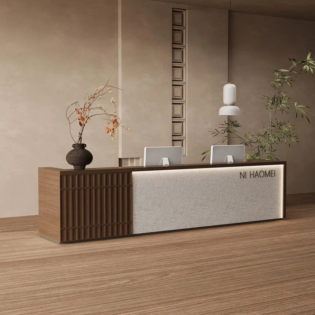 This reception desk weaves Oriental elegance with modern functionality, making it a standout for serene, upscale spaces. The vertical slatted wood panel adds a warm, textured charm that softens the venue’s vibe, while the speckled stone-like countertop feels smooth and premium to the touch. Users love how its integrated LED lighting casts a gentle glow—perfect for creating a welcoming ambiance for guests. Hidden cable management keeps the workspace neat, and the dual-monitor setup fits busy reception needs seamlessly. It’s not just a desk; it’s a quiet statement of taste that makes every visitor feel relaxed and impressed.