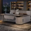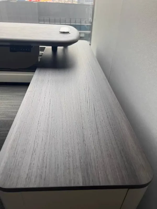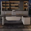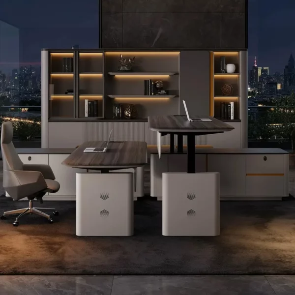This height-adjustable executive desk set blends sleek modern professionalism with ergonomic comfort—ideal for high-end home offices or corporate executive spaces. Its wood-grain tabletop (warm yet refined) pairs with a quiet electric lift frame (supports 65-125cm sit-stand transitions). Users rave about the integrated storage bench (tucks clutter + doubles as meeting seating) and the spacious surface (fits dual monitors + laptop effortlessly). The matte neutral base syncs with backlit shelving, while sturdy metal components ensure stability even during frequent height changes. It’s not just a desk; it’s a productivity-focused workspace that cares for your posture.