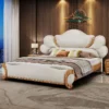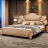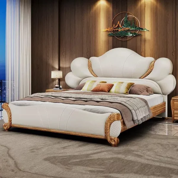 This beige leather bed blends luxurious traditional charm with modern comfort—ideal for high-end residential bedrooms or classic-style villas. Its curved tufted leather headboard (soft top-grain leather) features wheat-pattern accents (adds elegant rustic flair), while the solid wood frame (carved details) feels sturdy and ornate. Users love the plush padding (supports leaning in bed) and the neutral beige tone (blends with warm wood decor). The matching nightstands add cohesive style, and the durable leather holds up to daily use. It’s not just a bed; it’s a cozy focal point that turns the bedroom into a refined retreat.