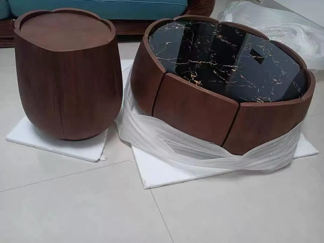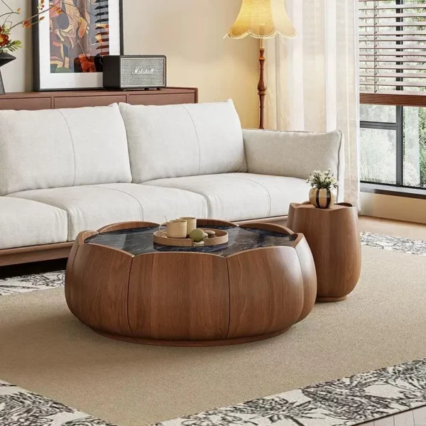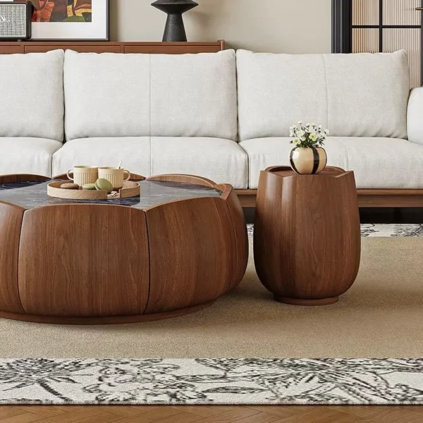 This sofa & coffee table set exudes Oriental gentle luxury—perfect for modern minimalist homes or cultural-themed spaces. The solid wood (walnut texture) coffee table features a lotus-petal shape that feels artistic yet warm, with a smooth stone inset for placing drinks without worry. Users rave about the sofa’s soft linen cushions (breathable, supportive for long sits) and the matching side stool that doubles as extra seating. The neutral palette blends seamlessly with both wooden decor and soft textiles, turning your living room into a cozy, refined retreat. It’s not just furniture; it’s a daily escape that wraps you in calm elegance.